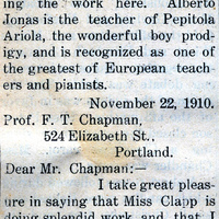 'Miss Clapp Receives High Praise in Germany for Work Done at Pacific Conservatory' Newspaper Clipping, Frances B. Clapp Scrapbook (1910), 71, Pacific University Archives, Forest Grove, Oregon.