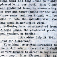 A newspaper clipping regarding Frances B. Clapp and her trip to London. The clipping states that Miss Clapp graduated from Pacific University in 1908 and is traveling to Germany to complete her education. It appears in a scrapbook compiled by Miss Clapp.