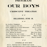 A program from the performance of Our Boys put on by the 1908 Pacific University public speaking department. The play was performed at the Crescent Theatre in Hillsboro, Oregon on June 18th, 1908. The actors and actresses listed were Jas R. Ward (probably James R. Ward, a 1909 Pacific University graduate), H.E. Witham (probably Herman Ernest Witham, a 1909 Pacific University graduate), Wm. E Gwynn (Probably William Elisha Gwynn, a 1910 Pacific University graduate), R. I. Imlay (probably Robert Alexander Imlay, a 1908 Pacific University graduate), F.W. Orr (probably Pacific University Professor of English and Public Speaking), Grace Payne (probably Margaret Grace Payne, a 1912 Pacific University graduate), W.E. Heidel (Probably Wilhelmina Esther Heidel, a 1908 Pacific University graduate), Frances B. Clapp (a 1908 Pacific University graduate) and H. Chandler (probably Helen Willena Chandler, a 1909 Pacific University graduate). This program appears in a scrapbook compiled by Frances B. Clapp.