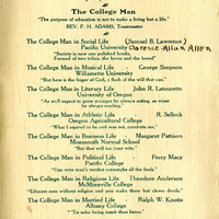A program for the oratorical annual banquet held in McMinnville, Oregon on March 8th, 1907. Representatives from seven different colleges in Oregon met in McMinnville to compete. William Elisha Gwynn, a Pacific University student, took third prize for his speech called, 'The Crown of Citizenship'. Gwynn was a 1910 Pacific University graduate. The banquet included an eight-course meal, the menu can be viewed in the program. After the lunch, several speakers spoke on the subject of the college man. This program appears in a scrapbook compiled by Frances B. Clapp, a 1908 Pacific University graduate.