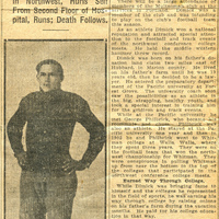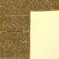 A newspaper article about Pacific University alumni, Ralph Dimick's death. Dimick jumped from a window at St. Vincent's hospital in Beaverton, Oregon on October 22nd, 1911. He had been injured during a Pacific University alumni football game played in Forest Grove on October 14th, 1911. During the game, he fell on the ball and was tackled by several other players. The newspaper article indicates that he received internal injuries that led to pneumonia. He was hospitalized at St. Vincent's hospital and had been constantly supervised by two nurses. On the morning of October 22nd, Dimick had persuaded his nurses to leave the room. After which he jumped twelve feet down from the window and took off running. He eventually collapsed and died. Dimick attended Pacific University during the 1904-1905 school year. After which he transfer to Whitman College for three years. He went to Notre Dame for graduate school and was very active on their football team. He had ambitions to be a lawyer before his death. This article appears in a scrapbook compiled by Frances B. Clapp, a 1908 Pacific University graduate.