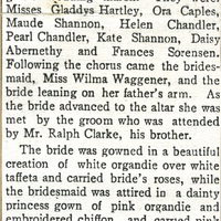 A newspaper article from The Index, the Pacific University newspaper. The article gives details about the wedding of William Clarke and Mary Bailey on April 18th, 1906. Bailey was a 1903 Pacific University graduate. Clarke attended Pacific University before leaving for Amherst and later Boston Polytechnical School. This article appears in a scrapbook compiled by Frances B. Clapp, a 1908 Pacific University graduate.