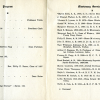 A program for the presentation of Missionary Service Flag to Pacific University. The missionary service flag was a commemorative flag made in honor of students and alumni of the university who had gone on to serve missions. The presentation event was held in Marsh Hall on February 10th, 1921. The program lists the names of students that have served as missionaries and the locations where each student served. Some names include: Frances B. Clapp (Kyoto, Japan); Joseph Elkanah Walker (China); Margaret "Dolly" Hinman (Turkey); and others. This program is part of a scrapbook compiled by Frances Clapp, a 1908 Pacific University graduate.