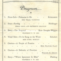 A program from the Preliminary Oratorical Contest held in Marsh Hall on January 25th, 1907. The contest included several students performing piano and vocal solos, story telling, as well as orations. The participants were listed as Acting Director of the Conservatory and Instructor in Piano, Miss Wilma Waggener '04, Music Conservatory students, Miss Maud Shannon and Miss Katheryn Shannon, Professor of English and Public Speaking, F. W. Orr, Miss Ethel Moseley '07, Miss Frances B. Clapp '08 and Mr. William E. Gwynn '10. The winner of the contest was Mr. Gwynn whom was awarded $15 and a gold P. Gwynn also qualified to represent Pacific University in McMinnville for the inter-collegiate contest that was held in March of 1907. This program appears in a scrapbook compiled by Frances B. Clapp.