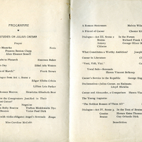 A program for the closing exercises of the third year class at Tualatin Academy. The festivities took place on June 18th, 1901. Students performed Julius Caesar. Student actors that were identified as Frances B. Clapp, Alice Sewell, Emerson Baker, Ethel Waters, Frank Brown, Edgar Colvin, Lilliam Lois Parker, Henrietta Elizabeth Bear, Estella Ruby Boscow, Rena Buxton, Trafton Micklewaite Dye, Victor Paul Dick, Caroline McCobb, Melvin Wilson Markham, Chester Kimes Fletcher, Richard Frank Peters, George Oliver Mowry, Joseph Jesse Patton, Clara Ida Irvin, Guy Forest Via, George Eugene Whipple, Lloyd Hicklin, Haven Vincent Belknap, Bertha Yoder, Horace Estes Thomas and Guy Orlando Dick. This program appears in a scrapbook album compiled by Frances B. Clapp, a 1908 Pacific University graduate.