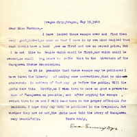 A letter from Eva Emery Dye, an active women's right supporter and author, to Mrs. Mary Farnham. The letter is dated May 15th, 1903 and commends female students at Pacific University for their essays written about Sacajewea. At this time Dye was head of the Sacajawea Statue Association in Portland, Oregon. The organization was responsible for raising money and commissioning the Sacajawea and John-Baptist statue erected in Portland's Washington Park on July 6th, 1905. The group raised $7,000 for the projected and hired Denver artist, Alice Cooper, to create the bronze statue. Dye is best known for her book Conquest: The True Story of Lewis and Clark. She is credited as the first person to give historical credit to Sacajewea. This letter appears in a scrapbook album compiled by Frances B. Clapp, a 1908 Pacific University student.