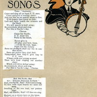 A scrapbook page titled Songs. The page contains two newspaper clippings with songs lyrics. One newspaper clipping is the Pacific University fight song. The other is a song about Pacific University, with the instructions that the song should be sung to the tune of Amherst. This scrapbook page appears in a scrapbook album compiled by Frances B. Clapp, a 1908 Pacific University graduate.