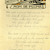 A scrapbook page entitled Chums, Autographs and Nom De Plume. That page contains a handwritten poem. This scrapbook page appears in a scrapbook compiled by Frances B. Clapp, a 1908 Pacific University graduate.