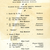 A program for a Pacific University recital held on February 21st, 1906 in Marsh Hall. The performers included Leah Lieser, Frances B. Clapp and Ethel Moseley. This program appears in scrapbook album compiled by Clapp, a 1908 Pacific University graduate.