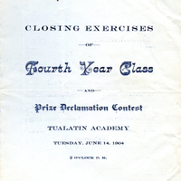 A program for the 1904 fourth year class closing exercises for the Tualatin Academy. The exercises were to be held on Tuesday, June 14th 1904. This program appears in a scrapbook album compiled by Frances B. Clapp, a 1908 Pacific University graduate.