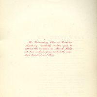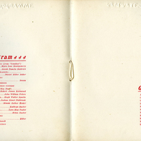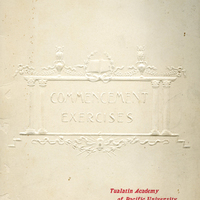 A Tualatin Academy commencement program for the 1903 graduating class. The graduates listed are Alice Eleanor Sewell, Catherine Anne Scott, Caroline Estelle Fitch, Daniel Miller Baker, Elelpha Margaret Ruble, Ella Blanche Huston, Esther Millicent Silverman, Harriet Burnett Connell, Helen Adelaide Rueter, Henry Roy Luce and Hugh Walter Sparks. This program appears in a scrapbook album compiled by Frances B. Clapp, a 1908 Pacific University graduate.