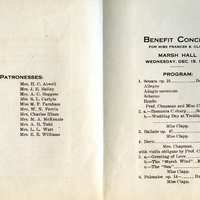 A program for a benefit concert held on behalf of Frances B. Clapp. It was held in Marsh Hall on Wednesday, December 15th, 1909. This program appears in a scrapbook album compiled by Clapp, a 1908 Pacific University graduate.