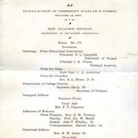 A program for the inauguration of Pacific University president, William N. Ferrin. The inauguration was held on October 14th, 1903 at 10:00am. This program appears in a scrapbook compiled by Frances B. Clapp, a 1908 Pacific University graduate.