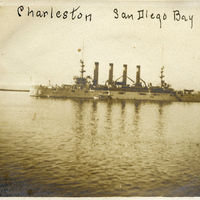 A photograph of the USS Charleston in the San Diego Bay. The date on the photograph indicates that it was taken on February 12th, 1909. This was the third USS Charleston, which was completed on January 23rd, 1904. The ship would go on to transport troops during World War I, before being decommissioned in 1923. This photograph appears in a scrapbook album that was compiled by Frances B. Clapp, a 1908 Pacific University graduate.