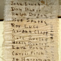 A piece of fabric with Tualatin Academy principal, Henry L. Bates, and several academy students names written on it. The date written at the top of the fabric is June 1902. The students listed are John Leach, Dan Baker, Ralph Dugan, Hue Sparks, Roy Luce, Gordon Clapp, Kate Rueter, Helen Rueter, Lora Foster, Carrie Fitch, Jo Harriman, Myra Montgomery, Ines Luce and Esther Silverman. This piece of fabric appears in a scrapbook album compiled by Frances B. Clapp, a 1908 Pacific University graduate.