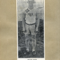A photograph of Pacific University athletic coach, Archie Hahn. The photograph appears to be cut out of the Heart of Oak, the Pacific University yearbook. Coach Hahn came to Pacific University in 1906. This photograph appears in a scrapbook compiled by Frances B. Clapp, a 1908 Pacific University graduate.