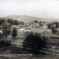 Picture taken from the water tower located on the west side of A Street between Pacific Avenue and 21st Avenue. View is looking northwest. The street on the right is 21st Avenue going west and the other is B Street going north from the left to the right. The house on the corner will be moved around the corner onto B Street at a later date. The current Post Office is where the trees are in the foreground. The white house on the left was A. T. Smith’s residence when he moved into town. The two houses mentioned here are still standing. This postcard appears in a scrapbook compiled by Frances B. Clapp, a 1908 Pacific University graduate.