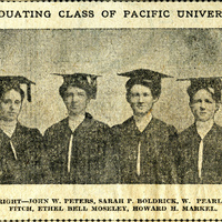 A photograph of the Pacific University graduating class of 1907. The photograph was clipped from a newspaper. The graduates are listed as follow: John Peters, Sarah Boldrick, Pearl Chandler, Carrie Fitch, Ethel Bell Moseley and Howard Markel. This photograph appears in a scrapbook compiled by Frances B. Clapp, a 1908 Pacific University graduate.