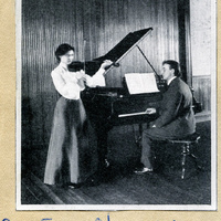 A photograph of Pacific University music professor, Frank Chapman, and Pacific University student, Bess Dooley. The photograph depicts Chapman instructing Dooley while she plays the violin. Chapman was the music professor at Pacific University from 1903-1916. This photograph appears in a scrapbook compiled by Frances B. Clapp, a 1908 Pacific University graduate.