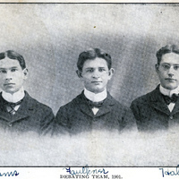 A photograph of the 1901 Pacific University Debate Team. The annotation with the photograph identifies the members as Richard Faulkner, a 1902 graduate, William Hale, a 1903 graduate and Clark Williams. This photograph appears in a scrapbook compiled by Frances B. Clapp, a 1908 Pacific University graduate.