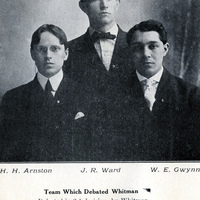 A photograph of the 1908 Pacific University Debate Team. The photograph appears to be from the Pacific University yearbook, The Heart of Oak. The caption with the photograph details a triangular debate between Pacific University, Willamette University and Whitman held on February 21st, 1908. The topic of the debate was Japanese immigration. The Pacific debate team beat Willamette, but fell to Whitman by a 2-1 decision. The members in the photograph are identified as Herbert Hayes Arnston, a 1908 graduate, James Richard Ward, a 1909 graduate, and William Elisha Gwynn, a 1907 graduate. This photograph appears in a scrapbook compiled by Frances B. Clapp, a 1908 Pacific University graduate.