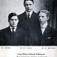 A photograph of the Pacific University debate team. The members are D. Irwin Aller and Robert A. Imlay, 1908 graduates and Herman E. Witham, a 1909 graduate. The caption with the photograph indicates that the three won the debate against Willamette University by unanimous decision. This photograph appears in a scrapbook compiled by Frances B. Clapp, a 1908 Pacific University graduate.