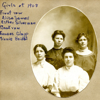A portrait of a group of female Pacific University students with the handwritten title, Girls of 1908. The caption with the portrait identifies the students as Alice Sewell, Esther Silverman, Frances Clapp and Minnie Heidel. This portrait appears in a scrapbook compiled by Clapp, a 1908 Pacific University graduate.