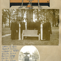 A page from a scrapbook compiled by Frances B. Clapp, a 1908 Pacific University graduate. The page contains a photograph of the 1908 graduating class from Pacific University. The handwritten caption under the photograph identifies the students as Robert Imlay, Wilhelmina Heidel, Claude Mason, Frances Clapp, Charles Aller, Gordon Clapp, Esther Silverman and Sam Lawrence. The students are standing around the "Spirit Bench" on the Pacific University campus. The bench was donated by the Class of 1908. The page also includes a photograph of an unknown female.