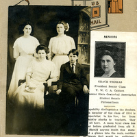 A scrapbook page titled Addresses that includes a portrait of Grace, Mildred, Ruth and Ted Thomas. It also contains a newspaper clipping that describes Grace Thomas, a 1914 Pacific University graduate. Grace was the senior class president, member of the Y.W.C.A. and a part of the Philomathean sorority. Ruth Thomas was a 1915 Pacific University graduate and Mildred Thomas was a 1916 Pacific University graduate. This scrapbook page appears in a scrapbook compiled by Frances B. Clapp, a 1908 Pacific University graduate.