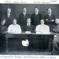 A photograph of the Pacific University newspaper, The Index's, staff. The students are identified as Sam Lawrence '08, Helen Chandler '09, Witham '09, Martha Holmes '09, C.D. Mason '08, R. A. Imlay '08, Esther Silverman '08, James Ward '09 and Frances B. Clapp '08. This photograph appears in a scrapbook compiled by Frances B. Clapp, a 1908 Pacific University graduate.
