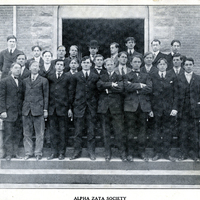 A photograph of Pacific University's Alpha Zeta society. The photograph was taken on the steps of Marsh Hall. This photograph appears in a scrapbook compiled by Frances B. Clapp, a 1908 Pacific University graduate.