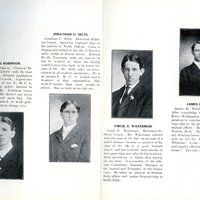A page from the Pacific University yearbook, the Heart of Oak. The yearbook page contains portraits of the junior class of 1908. The students are Harry P. Humphreys, Helen W. Chandler, H.E. Witham, Martha F. Holmes, Reginald H. Robinson, Jonathan U. Hilts, Virgil E. Waterman and James R. Ward. This yearbook page appears in a scrapbook album compiled by Frances B. Clapp, a 1908 Pacific University graduate.