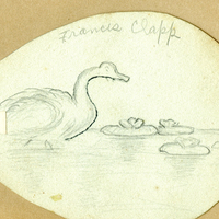 A card with an illustration of a swan on water with lily pads. The name Frances Clapp is handwritten at the top. This illustration appears in a scrapbook album compiled by Clapp, a 1908 Pacific University graduate.