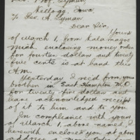 EDWD. M. ATKINSON,<br/>COUNSELOR AT LAW,<br/>49 WALL STREET.<br/>NEW YORK, March 3, 1880.<br/><br/>Rev. Prof. Lyman<br/>Kellog, Iowa,<br/><br/>To Rev. A. Lyman<br/><br/>Dear Sir:<br/><br/>Yours of March 1, from Kalaazoo mich. Enclosing money order for fourteen dollars and twenty-five cents is at hand this A.M.<br/><br/>Yesterday I recd from your brother in East Hampton M.O. for twenty-five dollars and have acknowledged receipt of it to him and to you.<br/><br/>In compliance with you of March 1, above named, I herewith enclose to you at above address a money order for that twenty five dollars.<br/><br/>There is nothing now in y hands if you for the purposes of the Hyde association and in money matters we are now square.<br/><br/>I would not add to my letter to you of march Feb’y 28th /80. The trouble has not been great and the matter is adjusted on all hands<br/><br/>Yours very truly<br/>Edwd. M. Atkinson.<br/><br/>Please acknowledge receipt of enclosed $25- A