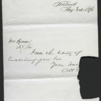 Portland<br/>May 3rd 1890<br/><br/>Mr Lyman<br/><br/>[?]<br/>I take the liberty of enclosing your bill<br/><br/>Yours truly<br/>CM [?]<br/><br/>Lead Pipe, Sheet Lead, BLOCK TIN, WROUGHT IRON PIPES, For Steam, Water and Gas, WATER CLOSETS, SEWER TRAPS, Streel Washers, Globe or Throttle Valves EVERY VARIETY OF BRASS COCKS, For Steam, Water and Gas; Rubber Hose, Hose Pipes, &c.<br/>COPPER, TIN & SHEET IRON WORK, ROOFING & GENERAL JOBBING.<br/><br/>[?] 1890<br/><br/>M Lyman Forest Grove<br/><br/>To C. H. MYERS, Dr.<br/>PLUMBER, GAS AND STEAM FITTER<br/>-Dealer In-<br/>Gas Fixtures, Cooking Ranges, Hot Water Boilers, Bath Tubs,<br/>MARBLE-TOP WASH STANDS, LIFT AND FORCE PUMPS, ETC<br/>HOTELS, PUBLIC BUILDINGS AND PRIVATE RESIDENCES<br/>Heated with the latest Improvements in Steam and Hot Air Apparatus } 110 FIRST STREET<br/><br/>Feb 1 To bran Turning 300<br/><br/>Lyman Forest Grove