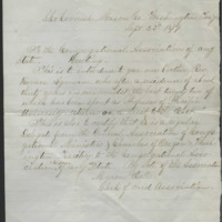 Skokomish Mason Co. Washington Ter’y.<br/><br/>Sept. 25. 1879<br/><br/>To the Congregational Association of any State. Greetings, <br/><br/>This is to introduce to you our brother Rev. Horace Lyman, who after a residence of about thirty years in our midst, the last twenty two of which has been spent as Professor of Pacific University, returns on a visit to the East.<br/><br/>This is also to certify that he is a regular Delegate from the General Association of Congregational Ministers & Churches of Oregon & Washington Territory to the Congregational Association or Conference of any other State. By vote of the Association<br/><br/>Myron Eells<br/><br/>Clerk of Said Association