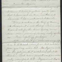 Walla Walla March 25-1865<br/><br/>Dear Mrs Lyman<br/><br/>It is certainly not because I have forgotten you or yours that I have not written, neither is it because I have not wanted to write.<br/><br/>“Procrastination is the thief of time.” A thousand & one things claim my time & all for the time being, seem seem more pressing is my only apology. Poor apology perhaps.<br/><br/>After we tho’t you were coming up here & did not come, & we did not hear from you any more till Mr Lyman wrote in the fall, we did not know what to think. But time passed on & we were fully occupied till Myron went down. Since then he has written us with one exception every week & I am impelled to write him once in three weeks.<br/><br/>It makes me homesick to write to the Grove & I am affraid I shall expose a discontented mind which I would rather not trouble my friends with. Other things being equal I think my health would be better here than below, tho’ I am not strong.<br/><br/>As in every new country there is almost every thing to do & we have but little strength to do it. This is a waste & barren land & most of the settlements are along on the creeks.<br/><br/>There is a striking resemblance in the moral, Religious, & Intellectual waste. I often think what can we do to improve it, but do not yet see that we can do much. It is painful to witness it & not do something.<br/><br/>Some fifteen months ago a Branch of the American Bible Society was formed in Walla Walla, & a few weeks since, receiv’d a lot of nice new bibles. We hope all who want, will now have a bible.<br/><br/>Edwin taught a pleasant school of twelve weeks of seventeen scholars. For various reasons, unavoidable, the average attendance was only thirteen & a half. The tuition was seventy-five cents a scholar per week. His eyes have not troubled him as much as they did last winter.<br/><br/>We have heard of a Mr Sloan of Birch creek being drown’d in Butter creek. We are affraid it is Mr Sloan of the Grove. Poor Mrs Sloan what will she do – what can she do? They are more than fifty miles from here.<br/><br/>The ministers at the Grove are feeding the people with knowledge & understanding- I hope they are being rewarded. Mr Chamberlain, is he at the Griffin’s yet. I am sorry for them, hope they will soon find their place. Do you hear from Mr Jenny? Where is Mr Dickinson? We had a letter from Mr Walker not long since.<br/><br/>Now about your own dear self. Is your health any better than it use to be? Has Sarah regained her health if so does she attend school. I should love to see her attend come [triping?] in [softly?] as she use to do.<br/><br/>I suppose Willie goes to school – perhaps he is studying Lattin by this time. Horrace & Mary can they go to school yet? How is Horrace lame limb. How they must have grown.<br/><br/>Do you think you will try to come up here in vacation? We should be glad to see you & all yours if you can come.<br/><br/>A great many Oregonians are coming up & going to the mines but the [travel?] travel does not generally pass this way now.<br/><br/>Much love to yourself & yours & believe me your friend<br/><br/>Myra F. Eells