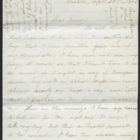 How do matters and things propose at the Grove this time? I hear that the school is full, but don’t know any particulars. And how are you getting along as matron of your establishment? I know that you obey my parting injunction of giving your friends “lots of goodies”. Hence I would like to know who are Sam’s, Beckwith’s Branet’s, [Ceofelius’?], Whalley’s, McCoy’s, and all the rest of the boys’, “bright, particular stars”. Don’t let any personal feelings in the matter make you backward about telling me. “Your confession, etc” you know. I would like so much to hear from May Eaton, and to know what she is doing. I wrote to her and Sarah Borolby a week ago, and hope to hear from them soon. Elia is at home by this time I suppose. I am so glad she can be there this winter, as I feel so much better to be away if she can only be at home.