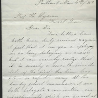 Portland Nov 5th/80<br/><br/>Prof. H Lyman Forest Grove<br/><br/>Dear Sir, <br/><br/>Your letters have both been duly received & again I feel that I owe you an apology in so long delaying an answer, but I can scarcely realize that it is nearly a month since the date of the first [three?] times has flown so rapidly away. At the Sunday school convention I was both delegate and [?] on refreshments which we served at the church two days in succession & immediately after that I was invited out to dinner four days in succession & that was followed with a two days sick headache besides various other things have made demands upon my time still all this ought not to have prevented my replying to your letter & would not have done so had I been decided in regard to what I ought to say to you. I purposed to comply to your wish to visit to the grove but the invitation which I had from the Cornelius family is of so long ago that I have felt somewhat delicate about going unless I would see them here in town as I frequently do & they should renew the invitation, but I have not seen any of them this fall. But all this is not the point “To be or not to be that is the question” I am to decide, I might say simply Yes or No as the case might be & keep back from you the thoughts which crowd themselves upon me & perhaps you would be better pleased if I should do so but to me this is a [?] question & I feel that I have no right to cast it from us without becoming fully persuaded that I am doing just what God would have me do. My life I trust is an [?] to Him to be as to do just what He would have me & so I can be in but sympathy with you in the work which you are doing & still I don’t feel sure that I should be any help to you. But while I stand alone as a distinct & separate individual my influence for good may be much more potent than when merged into our whole power & influence are so superior to mine. If I felt in the least restless or dissatisfied with my present place in the world I should not find it so difficult to decide to make a change. I have just received a letter from my sister in reply to one I wrote her telling her of your proposal to me and giving her all the facts in every possession in regard to yourself and family. She says to see if you do not accept that offer I think you will be very unwise. Why she says do you persist in living alone in the world & you know she says I have often told you you ought to be a minister’s wife & then she would feel so much better about me if I had a good husband than to have me here all alone. But I have been alone so long that it does not seem anything dreadful to me & I think I grow more & more fearful of making a change. If you are tired of my indecision and desire to drop this I shall accept this as alright, but if you desire to write me or visit me again you are at liberty to do so.<br/><br/>Yours Sincerely, Mrs. A.E. Forrey