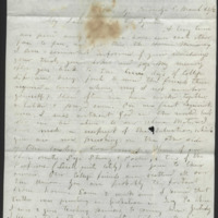 After returning from Ga. where I taught 2 years I entered a law office in Auburn where I studied 2 years and more & then returned to teaching, which I have adopted as my profession for life. This profession affords me a good living & a wide field for usefulness. I am in my 2nd year in Elbridge, & doing pretty well. But I have a strong inclination to go to California or Oregon & offer my services-- and perhaps in a couple of years you may hear from me in California or see me in Oregon-- most probably the former. I am married & have one child-- my wife is an experienced teacher, and is now engaged in teaching music and piano. French & German. I was in Auburn last week-- Mr. Nelson has the 1st church-- the 2nd church is vacant-- Dr. Lathrop having left Dr. Hickock is expected to leave for [Union?] College during the year. Prof. Smith has gone to N.J. The seminary is quite flourishing. I doubt whether you will ever get this letter-- if you do-- answer it, and tell me how much of a family you have, how you are & all the news. I should be very happy to hear from you and my best respects to your Lady--and my good wishes & prayers to yourself.