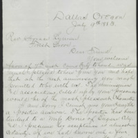 Dallas Oregon<br/>July 9th 1888<br/>Rev. Lyman <br/>Forest Grove<br/><br/>Dear Friend <br/><br/>Your welcome favor of 4th wish cause only to hand was much pleased to hear from you and hope that on the next anniversary you may be permitted to be with us_ [?] and associations called up by your presence would be of the mash pleaseaun character. <br/><br/>I am sorry I cannot give your daughter a positive answer_ the position has been tedudered to a miss Dorris of Eugene City_ and I presume her acceptance is always a certainty- if we had known only for day earlier of your Daughters desire.<br/><br/>I think she would have received the appointment [?] [?].<br/><br/>In case of the mon- acceptance of miss Dorris H will be a pleasure to me to prep her claims _ will write as soon as I know.<br/><br/>Hoping to see you[?] [?] [?] day- with much respect <br/><br/>[?] Yours Very Truly<br/>J.D. Lee