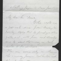 I regret very much your sickness and hope you are well or nearly well by this time. I'm glad you [?] your children ministering to your wants. I am not informed what your [labor ?] in W.T. is or whether it was preaching or teaching. You will have to make your labor if possible in accordance with your own strength and not overtask your ability physically or mentally. I shall be anxious to learn of your health as soon as possible. Is Willie engaged this year in the Pacific University and if so in what capacity? We have had very severe weather since N. Year's day, though it is now more mild. Jan. 2 the mercury was -25 at sunrise -13 the warmest part of the day and 3rd -25; at sunrise and -23; on the 4th and -17; on the 5th. Our love to all your dear family.