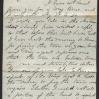 I have not heard from you for a long time and know not why it is so. I wrote you late in Autumn [scratched out] should have received a while to that before this but I [?] [?]. I have send the money to give for paying the taxes on your land and my agent informs me that the taxes are between twenty one and twenty two dollars. In one of our late letters you speak of it being hard to [?] the money to pay the taxes and inquire [?] I could not sell a portion of the land to assist in paying the taxes? I have stated in one of my letters that I thought it would be better to manage if possible in some way to pay the taxes for a while. Hoping that the [?] will improve on the railroad progression westward. I am not informed at what [?] your land could be sold at the present time, but I should think it would pay to [?] the land worth [standing?] the taxes till the railroad is through for there [?] [?]. The price will be [?] improved.