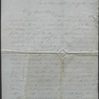East Hampton July 2 -48<br/><br/>Very dear Mary<br/><br/>I take my pen to write somewhat in doubt as to what I ought to do: ie. whether I ought to write now, or delay writing awhile. I wrote you a fortnight ago to day, and I have been looking for a reply several days, but as yet have rec.d none. Perhaps I ought not to have expected one this early; yet I could not [?] do so, and not having rec.d it I begin to fear that it has miscarried, or at least that your did not receive it as early as I intended you should. I forwarded it four days previous to the Tuesday on which I agreed, Providence favoring, you should have a letter: ample time I supposed for its journey, and seasonable arrival at its place of destination. If it was not [?] in judgment. I would delay two or three days longer before writing, were it not for the [?], than if you are still at Union-Falls, a day's delay on my part will cause a week's delay in it reception.<br/><br/>I have been a short time to write before the mail goes out, and in this time I scarcely know what to write. [?] I sure you had not rec.d my other letter I would expect its most important parts. As it is I will repeat but little. I must repeat some.<br/><br/>In regard to my journey home I will simply say, that I left Castleton the Thursday night next after we packed, and arrived at home on the subsequent Tuesday, in good health and spirits. My journey was pleasant and prosperous. At New York I saw the Secretaries of the U.M. Soc. They thought it would be wise for us, (if it were possible) to make our arrangements to embark in Oct: so that is it should be deemed best for us to go by sailing vessel, we might be in readiness to embark in the right season, which is during that month. If we go by steamers I suppose we shall not embark before Dec. or Jan. This would give ample time for preparation should be made in reference to the most necessary and important particulars. I told the secretaries that it was our decided choice, to go by the steamers if they should deem it practicale and best; but intimated our willingness to be governed their wisdom and judgment in this matter.<br/><br/>And now as I have little more time to write this morning, permit me to say, that thoughts of you, and of our proposed continued and more intimate intercourse have very much occupied my mind ever since we gave each other the parting hand, and the parting kiss. I rejoice that Mr Denison did not [?] you an [?] [?], for in those few house of acquaintance which we subsequently enjoyed, I became more fully [?] than before, that your breast was filled with kindly and affectionate feeling; that you had a heart to sympathize and to love. The expression on your part of such sympathy and affection, kindled up corresponding feelings in my own bosom, which I assure you is not incapable of such emotions. And here as in my last letter I pledge myself, that if Providence permit us to accomplish our intentions, by this assistance, while my right arm retains its strength, and my mind its intelligence, you shall possess one friend at least to sympathize with, and care for you. If you have rec.d my first letter, I trust you will excuse whatever of repetition you find in this, as it seemed necessary to me, from my uncertainty about that, to give some of its facts and thoughts in this.<br/><br/>If you have not written, please write immediately on the reception of this letter, and state to me also where I shall direct my next. I shall direct this to the care of your nephew, Robert Duncan at Keesville, as I may have directed my former one wrongly: requesting him to forward it to you.<br/><br/>I expect now to be in Castleton sometime in the month of August.<br/><br/>Your real Friend and true Lover.<br/><br/>Horace Lyman