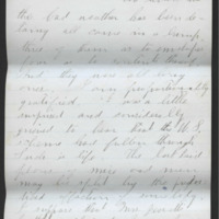 The letter that the bad weather has been detaing all came in a lump, three of them as to envelope four as to content thereof. And they were all long ones. I am proportionality gratified. I was a little surprised and considerably grieved to hear that the U.S. scheme had fallen though Such is life. The best laid fears of mice and men may be split by the [?] affection of some body. I suppose that Mrs [?] brother wished to have a hand in or both hands in the [?] and thought there would not be room for him if you were there. It was probably best for J and S to light out under the circumstances. Such an enterprise depends for its [?] upon the friendliness and good will of the individuals concerned. Yet it seems too bad. It is very much too bad. And for Father to be played out too! I look to see some of my [?] [?] past bitter, next. To scrape along in a small puttering way is under really the common tale, and is a fact, the natural way for small people to go in. Yet as I [?] add, life is itself such a majestic thing, think the little differences of rich and poor, small and great, [?] and unknown, viewed in the light of eternity will seem in [?] [?] I now [?] [?] of Mr [?] would not add much to the view he could command by fishing up a few stoves and getting upon it them, to see. Even so the [?] and all that sort of thing; all that is but in us can be used and enjoyed and [?] it says as well in a [?] as in a high place. And further a dew drop is decidedly nice in the [?], but try to institute it for the sun, it would become night unto being ridiculous I think me full into just abroad the place that fits us, [?] as we will. To prepare a few of the dying for death, out a few of the living for life, is evening to be my ambition. The raindrop [?] to to [?] a rainbow, as it falls; then it spatters on the ground, and is spill - not [?] perhaps; it may be rained in power.