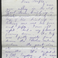 I am now sitting in the old [?], [?], building, in Rich’s [home?], taking advantage of his kindness in letting me use his pen and paper. I am all right, had a very pleasant journey down. The trip was firstly quite fine down the [?][white?], calm, the great [?] etc----. The [?][?][?]. We [?] at 7 P.M. Tuesday. We [?] at the Golden Gate at 11 A.M. this Thursday morning. Yesterday we had quite a breeze on the ocean, causing quite a [?]. The ship speeded along making as much as 18 miles in an hour. Her machinery began to heat, however, and so she slowed down a little.