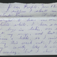 Dear People, Nov 12th <br/><br/>I suppose I shall not start tomorrow. Willie wanted to have me wait a little while. I hear a couple of boys in [latin] over here at my [?], and that helps him a little, so I will stay this week out. I do not exactly like to start Sunday, but I shall have company if I do. I would have company if I started tomorrow also. We have been talking to Alice [Chaberlain] about taking the place of assistant. She seems rather inclinded toward it. Mr. L said he should like to have her have such a place very much if she could arrage to take it. Sarah is very much disinclined to go home. I do not think she had better. She says it would about half kill her to do so, and I don’t know but it would. It would be the old stay over again of her Tornhill [?] teaching experiment. Also her affections about the society about the Grove would be revived. I do not know if she can do enough to pay her board bill here, but we had better do anything rather than have her go through the old scenes. <br/><br/>We are having cold, clear intensly bright frosty weather. It was not warm enough to melt the frost on the North side of building yesterday. So it was warmer today. The nights are magnificent. The moon is full and outsinned its lamp. <br/><br/>I have been gratefully waking myself up to a climax about going home. If anything should happen to prevent it, I would feel as flat as collapeed airbag. Let something may happen even now. We shall have to keep holding both schools now, or else be involded in finacial disaster; obliged to use up the farms land money for living expenses and sell all the rest of our profit to pay our debts. But I think we can hold on to both, and come out swimmingly. I will give every cent $300 (which I haven’t given to H.L, to pay the debt. <br/><br/>Goodbye, H.L