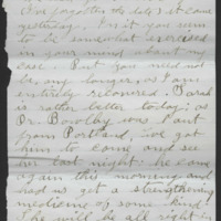 We read your letter of [?] forgotten the date it came yesterday, [?] it you seem to be somewhat exercised in your mind about my case. But you need not lie, any longer as I am entirely [?]. Sarah is rather better today, as [?].[?] was out from Portland, I’ve got him to come and see her last night: he came again this morning and had us get a strengthening medicine of some kind. She will be all right in a few days I think. Willie and I have been working at the [oats] this morning. W. thinks that cannot get them all into the barn, more than we thought. We could not get all the hay into the space [?] to it and so had to make a small stack. Yesterday we had the first [?] of green corn which was too small. Mary was considerably offended that you wrote so much more about my [?] than about hers.