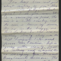 Sunday, the 15th <br/><br/>“You have been real good about writing so far” aha you little patty, is that you? I see you now. It is a morning in June. The air is a little smoky, and the sun is becoming warm. We are in the buggy, we three S, John and I and we are rolling [?] [?] slowly along over the hill [Lusignot’s] lake word from Mr. Purdin. Bess is going rather slowly for we are [?] and interested. We are discussing Gen. Howards BA sermon. The noise of the waves that came to the strand telling the secret of the “mighty waters rolling [everman?]” is in our ears. <br/><br/>I am doing better than you are, I am afraid, in the matter of writing. But yet not better. You are busy. You and the mistress of the manse and feel a little worried lest the affairs of the household will not run smoothly. Do you feel lonesome any? I would take kind of a wicked joy in It if you do. You have your hands full. I like an unburied ghost, lingering around the short of the stix unable to make my weak moen heard, and why to drop fragments off of the cranial plates. Whenever I feel lonesome have only one consolation i.e drop fragments. When I write I feel nearer hom, just perhaps as when people pray they feel nearer heaven. You must not imagine however that I am very fearfully lonesome. That is not the case. I am enjoying myself. I think that in a week more I shall be very much interested in my school work. I intend to bend all energies on it. Make myself and my scholars toe the mark. You, W, knew how easy it is to let a little matter go; it seems so much trouble to speak every time a scholar don’t do just right. I shall have to conquer this vein of weakness. I have heard you say that you had exhausted the same thing in your management. Friday I rose above it; in one case at least. In geomentry I said to have the books closed, Mr. Gase, went to the board and kept his open. I remarked that when I said I wished to have the books closed, I wished to have the books closed. I then requested him to take his seat. He took this sear and afterward fellow apologized. He is a pretty good fellow and evidently meant nothing wrong. But I established a point: a small one. If one really gets himself used to making all obey and gets them used to it all will be well. <br/><br/>“Dinner’ – Smith <br/>“Yes” Lyman<br/><br/>They had a good dinner, oysters, baked beef, potatoes, tomatoes, with bread, pie, [grapes] etc.