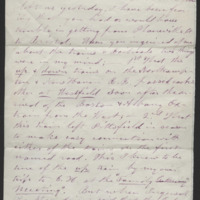 Ever since you left us yesterday I have been fearing that you had or would trouble in getting from Plainville, CT. to Bristol. When you inquired of me about the trains and railroads two things were in my mind: 1st that the up + down trains on the North Hampton and New Haven R.R. passed each other at Westfield soon after the arrival of the Boston + Albany [?] train from the West; 2nd that this train left Pittsfield in season to make easy connection with either of the trains on the first manned road. This I knew to be true of the up train by my own trip to E.H. at the “Family Gathering Meeting.” But when [?] (the Stage [driver?]) said that the Express train going East did not pass Pittsfield till “XII 36.” I instantly became aware that either the time the B + A. Ex. Train had been changed or that he had been misinformed. But by inquiry at the Hotel room after you left, I found [?] was right. And I knew you could not reach Plainville till about VII o’clock P.M. I then remembered that I had formerly had difficulty in getting from Plainville to Bristol at a late hour, + once or twice had been obliged to walk with a heavy valise; though I have also once or twice caught opportunity to ride on private [?]. I hope you too were successful in either meeting a late train or some private train. Also that you will have a pleasant + successful time at Bristol.